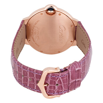 18kt rose gold case with a purple (alligator) leather strap. Fixed 18kt rose gold bezel. Silver dial with blued-steel sword-shaped hands and diamond hour markers. Roman numeral appears at the 12 o'clock position. minute markers around an inner ring. Dial Type: Analog. Cartier Calibre 076 Automatic movement, based upon ETA 2670, containing 25 Jewels, bitting at 28800 vph, and has a power reserve of approximately 38 hours. Scratch resistant sapphire crystal. Pull / push crown. Solid case back. Round case shape, case size: 36.2 mm, case thickness: 12.05 mm. Band width: 20 mm. Tang clasp. Water resistant at 30 meters / 100 feet. Functions: hour, minute. Ballon Bleu De Cartier Series. Dress watch style. Watch label: Swiss Made. Cartier Ballon Bleu Silver Dial 18kt Rose Gold Purple Leather Unisex Watch WE902028.