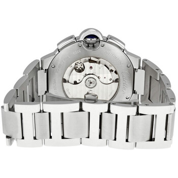 Stainless steel case and bracelet. Fixed stainless steel bezel. Silvered flinque dial with blue steel hands and Roman numeral hour markers. Mintue markers around the inner ring. Date display at the 9 o'clock position. Chronograph - two sub-dials displaying: 30 minutes and 60 seconds. Automatic self winding movement. Scratch resistant sapphire crystal. Fluted steel crown with a blue synthetic spinel. Skeleton case back. Case diameter: 47 mm. Case thickness: 15 mm. Deployment clasp. Water resistant at 30 meters/ 100 feet. Functions: hours, minutes, seconds, calendar, chronograph. Cartier Ballon Bleu Silver Dial Chronograph Men's Watch W6920002.
