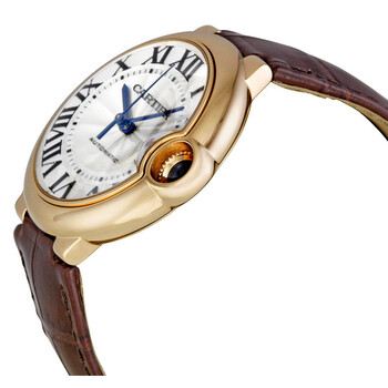 18kt rose gold case with a brown leather strap. Fixed 18kt rose gold bezel. Silver dial with blue steel hands and Roman numerals hour markers. Minute markers around an inner ring. Dial Type: Analog. Automatic movement with a 38-hour power reserve. Scratch resistant sapphire crystal. Pull / push crown. Solid case back. Case diameter: 36.2 mm. Case thickness: 11.9 mm. Round case shape. Band width: 17 mm. Band length: 9 inches. Tang clasp. Water resistant at 30 meters/ 100 feet. Functions: hours, minutes. Dress watch style. Watch label: Swiss Made. Cartier Ballon Bleu Silver Dial Unisex Watch W6900456.