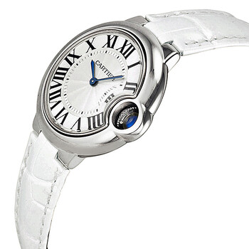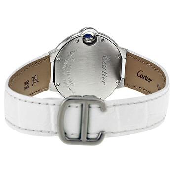 Stainless steel case with a white alligator leather strap. Fixed stainless steel bezel. Silvered opaline dial with blue sword-shaped hands and Roman numeral hour markers. Minute markers around an inner ring. Dial Type: Analog. Cartier Calibre 057 quartz movement. Scratch resistant sapphire crystal. Fluted crown set with a blue spinel cabochon. Solid case back. Case size: 33 mm. Case thickness: 9.96 mm. Round case shape. Band width: 20 mm. Deployment clasp with a push button release. Water resistant at 30 meters / 100 feet. Functions: hour, minute. Luxury watch style. Watch label: Swiss Made. Cartier Ballon Bleu Silver Dial Ladies Watch W6920086.