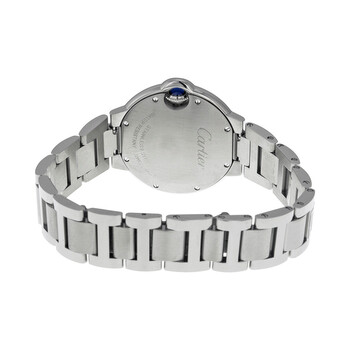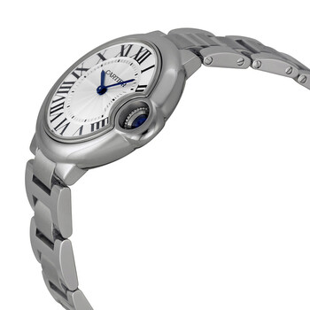 Stainless steel case with a stainless steel bracelet. Fixed stainless steel bezel. Silvered opaline dial with blue sword-shaped hands and Roman numeral hour markers. Minute markers around an inner ring. Dial Type: Analog. Quartz movement. Scratch resistant sapphire crystal. Fluted crown set with blue synthetic spinel cabochon. Solid case back. Case diameter: 33 mm. Case thickness: 9.96 mm. Round case shape. Deployment clasp with a push button release. Water resistant at 30 meters / 100 feet. Functions: hour, minute. Luxury watch style. Watch label: Swiss Made. Cartier Ballon Bleu Silver Dial Stainless Steel Ladies Watch W6920084.
