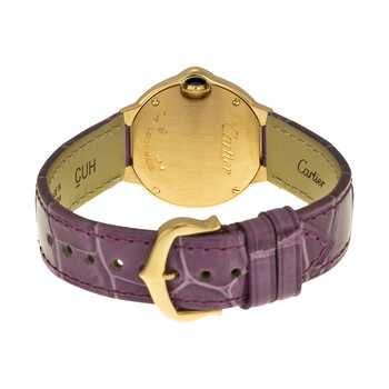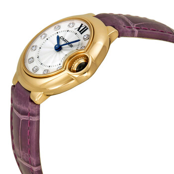 18kt rose gold case with a purple leather strap. Fixed 18kt rose gold bezel. Silver dial with blue hands and diamond hour markers. Roman numeral marks the 12 o'clock position. minute markers around the inner ring. Dial Type: Analog. Quartz movement. Scratch resistant sapphire crystal. Pull / push crown set with blue synthetic cabochon. Solid case back. Case diameter: 28 mm. Case thickness: 9.35 mm. Round case shape. Band width: 17.8 mm. Band length: 7 inches. Tang clasp. Water resistant at 30 meters / 100 feet. Functions: hour, minute, second. Dress watch style. Watch label: Swiss Made. Cartier Ballon Bleu Silver Diamond Dial 18kt Rose Gold Purple Leather Ladies Watch WE902050.
