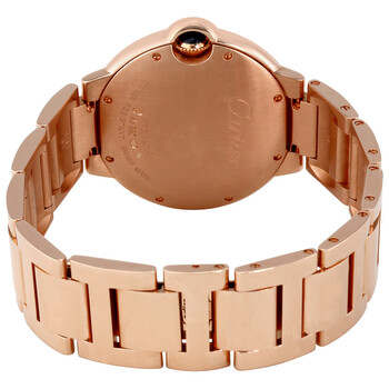 18kt rose gold case with a rose gold-tone 18kt rose gold bracelet. Fixed 18kt rose gold bezel. Silver dial with blued-steel sword-shaped hands and diamond hour markers. Minute markers around the inner ring. Dial Type: Analog. Cartier Calibre 076 Automatic movement, based upon ETA 2670, containing 25 Jewels, bitting at 28800 vph, and has a power reserve of approximately 38 hours. Scratch resistant sapphire crystal. Solid case back. Round case shape, case size: 36.2 mm, case thickness: 11.9 mm. Hidden fold over clasp. Water resistant at 30 meters / 100 feet. Functions: hour, minute. Ballon Bleu De Cartier Series. Dress watch style. Watch label: Swiss Made. Cartier Ballon Bleu Silver Diamond Dial 18kt Rose Gold Unisex Watch WE902026.