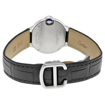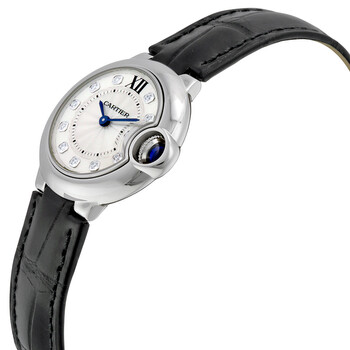Stainless steel case with a black alligator leather strap. Fixed stainless steel bezel. Silver dial with blue hands and diamond hour markers. A Roman numeral appears at the 12 o'clock position. Minute markers around the inner ring. Dial Type: Analog. Quartz movement. Scratch resistant sapphire crystal. Screw down crown. Solid case back. Case diameter: 28 mm. Case thickness: 9.35 mm. Round case shape. Deployment clasp. Water resistant at 30 meters / 100 feet. Functions: hour, minute. Luxury watch style. Watch label: Swiss Made. Cartier Ballon Bleu Silver Diamond Dial Black Alligator Leather W4BB0008.