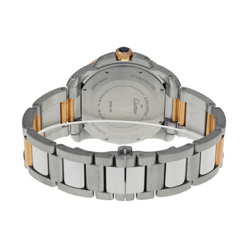 Silver-tone stainless steel case with a two-tone (silver-tone and rose gold-tone) stainless steel and 18kt rose gold bracelet. Uni-directional rotating coin edge 18kt rose gold bezel with a black top ring. Black dial with luminous rose goild hands and Roman numeral hour markers. Minute markers around the outer rim. Dial Type: Analog. Luminescent hands. Date display at the 3 o'clock position. Small seconds sub-dials subdials. Cartier Calibre 1904-PS MC Automatic movement, containing 27 Jewels, bitting at 28800 vph, and has a power reserve of approximately 48 hours. Scratch resistant sapphire crystal. Screw down crown. Solid case back. Round case shape, case size: 42 mm, case thickness: 14 mm. Deployment with push button release clasp. Water resistant at 300 meters / 1000 feet. Functions: date, hour, minute, second. Calibre De Cartier Series. Luxury watch style. Watch label: Swiss Made. Cartier Calibre Black Dial Steel and Rose Gold Men's Watch W7100054.