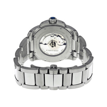 Stainless steel case with a stainless steel bracelet. Fixed stainless steel bezel. Silver opaline dial with luminous hands and Roman numeral hour markers. Arabic numeral minute markers (at 5 minute intervals). Minute markers around the outer rim. Dial Type: Analog. Luminescent hands and markers. Date display appears at the 3 o'clock position. Small seconds sub-dial. Cartier calibre 1904PS MC automatic movement with a 48-hour power reserve. Scratch resistant sapphire crystal. Steel crown with a faceted blue synthetic spinel. Skeleton case back. Case size: 42 mm. Case thickness: 10 mm. Round case shape. Band width: 24 mm. Deployment clasp. Water resistant at 30 meters/ 100 feet. Functions: hours, minutes, seconds, calendar. Dress watch style. Watch label: Swiss Made. Cartier Calibre de Cartier Silver Dial Stainless Steel Automatic Men's Watch W7100015.