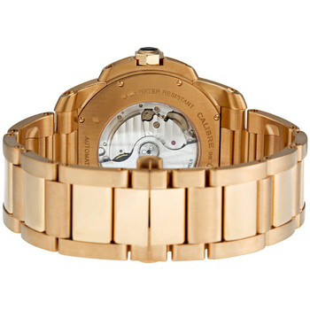 18kt rose gold case with a 18kt rose gold link bracelet. Fixed 18kt rose gold bezel. Chocolate brown dial with luminous hands and Roman numeral hour markers. Minute markers around the outer rim. Dial Type: Analog. Date display appears at the 3 o'clock position. Small seconds sub-dial above the 6 o'clock position. Automatic movement. Scratch resistant sapphire crystal. Transparent case back. Case diameter: 42 mm. Case thickness: 10 mm. Deployment clasp. Water resistant at 30 meters/ 100 feet. Functions: hours, minutes, seconds, calendar. Luxury watch style. Cartier Calibre de Cartier Brown Dial 18kt Rose Gold Men's Watch W7100040.