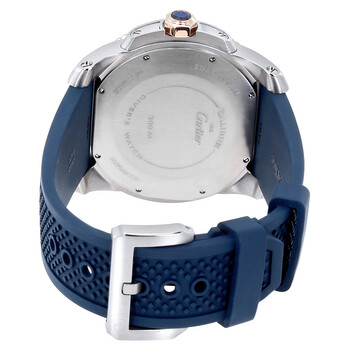 Stainless steel case with a blue rubber strap. Uni-directional rotating 18kt rose gold bezel with a blue ceramic top ring. Blue dial with rose gold-tone hands and Roman numeral hour markers. Minute markers around the outer rim. Dial Type: Analog. Luminescent hands and markers. Date display at the 3 o'clock position. Seconds sub-dial at the 6 o'clock position. Cartier calibre 1904-PS MC automatic movement with a 48-hour power reserve. Scratch resistant mineral crystal. Screw down crown. Solid case back. Case size: 42 mm. Case thickness: 11 mm. Round case shape. Tang clasp. Water resistant at 300 meters / 1000 feet. Functions: date, hour, minute, second. Luxury watch style. Watch label: Swiss Made. Cartier Calibre De Cartier Diver Automatic Men's Watch W2CA0009.