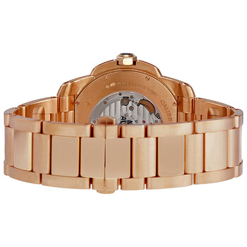 18kt rose gold case with a 18kt rose gold bracelet. Fixed 18kt rose gold bezel. Silver opaline dial with luminous hands and Roman numeral hour markers. Minute markers around the outer rim. Dial Type: Analog. Date display appears at the 3 o'clock position. Small seconds sub-dials. Cartier Calibre 1904PS MC automatic movement with about 48 hours of power reserve. Scratch resistant sapphire crystal. Case size: 42 mm. Round case shape. Hidden folding clasp. Water resistant at 30 meters/ 100 feet. Functions: hours, minutes, seconds, calendar. Dress watch style. Watch label: Swiss Made. Cartier Calibre de Cartier Silver Dial 18K Rose Gold Automatic Men's Watch W7100018.