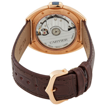 18kt rose gold case with a brown (alligator) leather strap. Fixed 18kt rose gold bezel. Flinque sunray dial with blued-steel sword-shaped hands and Roman numeral hour markers. Minute markers around the outer rim. Dial Type: Analog. Date display at the 6 o'clock position. Cartier Calibre 1847 MC Automatic movement, containing 23 Jewels, bitting at 28800 vph, and has a power reserve of approximately 42 hours. Scratch resistant sapphire crystal. Screw down crown. Transparent case back. Cushion case shape. Case size: 35 mm. Case thickness: 10.09 mm. Tang clasp. Water resistant at 30 meters / 100 feet. Functions: date, day, hour, minute, second. Cle Series. Luxury watch style. Watch label: Swiss Made. Cartier Cle Automatic Flinque Sunray Dial Ladies Watch WGCL0013.