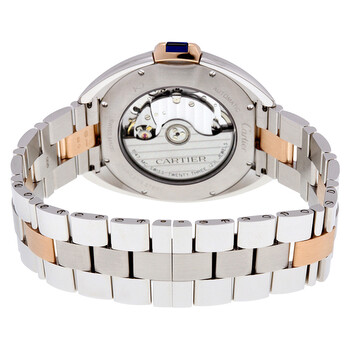 Stainless steel case with a stainless steel bracelet with 18kt rose gold links. Fixed stainless steel bezel. Silver dial with blued-steel sword-shaped hands and Roman numeral hour markers. Minute markers around the outer rim. Dial Type: Analog. Date display at the 6 o'clock position. Cartier calibre 1847 MC automatic movement, containing 23 Jewels, bitting at 28800 vph, and has a power reserve of approximately 42 hours. Scratch resistant sapphire crystal. Flush-mounted crown set with blue synthetic spinel cabochon. Transparent case back. Round case shape. Case size: 40 mm. Case thickness: 11.76 mm. Band width: 20 mm. Deployment clasp. Water resistant at 30 meters / 100 feet. Functions: date, hour, minute, second. Cle Series. Luxury watch style. Watch label: Swiss Made. Cartier Cle Automatic Silver Dial Men's Watch W2CL0002.