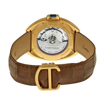 18kt rose gold case with a brown (alligator) leather strap. Fixed 18kt rose gold bezel. Silvered flinque sunray dial with blued-steel sword-shaped hands and Roman numeral hour markers. Minute markers around the outer rim. Dial Type: Analog. Date display at the 6 o'clock position. Cartier calibre 1847 MC automatic movement, containing 23 Jewels, bitting at 28800 vph, and has a power reserve of approximately 42 hours. Scratch resistant sapphire crystal. Transparent case back. Cushion case shape. Case size: 40 mm. Case thickness: 11.79 mm. Band width: 20 mm. Deployment clasp. Water resistant at 30 meters / 100 feet. Functions: date, hour, minute, second. Cle Series. Luxury watch style. Watch label: Swiss Made. Cartier Cle Automatic Silver Flinque Dial 18kt Rose Gold Men's Watch WGCL0004.