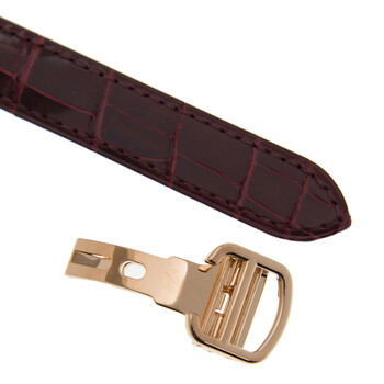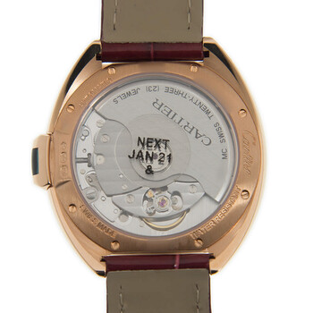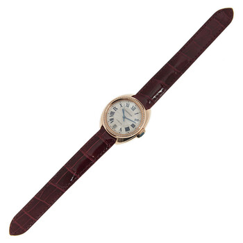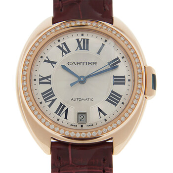 18kt rose gold case with a bordeaux alligator leather strap. Fixed 18kt rose gold diamond set bezel. Silver dial with blued-steel sword-shaped hands and black Roman numeral hour markers. Minute markers around the outer rim. Dial Type: Analog. Date display at the 6 o'clock position. Cartier Calibre 1847 MC Automatic movement, containing 23 Jewels, bitting at 28800 vph, and has a power reserve of approximately 42 hours. Scratch resistant sapphire crystal. Cabochon crown. Transparent case back. Round case shape, case size: 35 mm, case thickness: 10.09 mm. Water resistant at 30 meters / 100 feet. Functions: date, hour, minute, second. Additional Info: original box, international warranty card, manual (complete accessories). Cle Series. Luxury watch style. Watch label: Swiss Made. Cartier Cle Diamond Silver Dial Ladies Watch WJCL0048.
