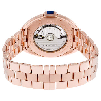 18kt pink gold case with a 18kt pink gold bracelet. Fixed 18kt pink gold bezel. Silvered flinque dial with blued-steel sword-shaped hands and Roman numeral hour markers. Minute markers around the outer rim. Dial Type: Analog. Date display at the 6 o'clock position. Cartier Calibre 1847 MC Automatic movement, containing 23 Jewels, bitting at 28800 vph, and has a power reserve of approximately 42 hours. Scratch resistant sapphire crystal. Blue spinel cabochon crown. Transparent case back. Cushion case shape, case size: 40 mm, case thickness: 11.76 mm. Fold over clasp. Water resistant at 30 meters / 100 feet. Functions: date, hour, minute, second. Luxury watch style. Watch label: Swiss Made. Cartier Cle Silvered Flinque Dial 18kt Rose Gold Men's Watch WGCL0002.