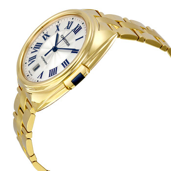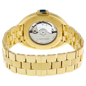 18kt yellow gold case with a yellow gold-tone 18kt yellow gold bracelet. Fixed 18kt yellow gold bezel. Silvered flinque dial with blued-steel sword-shaped hands and Roman numeral hour markers. Minute markers around the outer rim. Dial Type: Analog. Date display at the 6 o'clock position. Cartier calibre 1847 MC automatic movement, containing 23 Jewels, bitting at 28800 vph, and has a power reserve of approximately 42 hours. Scratch resistant sapphire crystal. Transparent case back. Cushion case shape, case size: 40 mm, case thickness: 11.76 mm. Hidden fold over clasp. Water resistant at 30 meters / 100 feet. Functions: date, hour, minute, second. Luxury watch style. Watch label: Swiss Made. Cartier Cle Silvered Flinque Dial 18kt Yellow Gold Men's Watch WGCL0003.