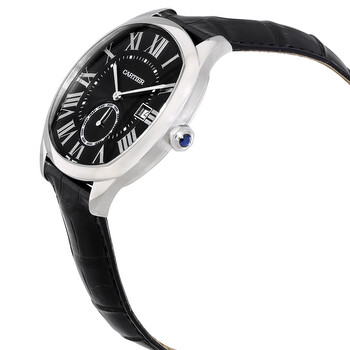 Stainless steel case with a black (alligator) leather strap. Fixed stainless steel bezel. Black dial with silver-tone hands and Roman numeral hour markers. Minute markers around an inner ring. Dial Type: Analog. Date display at the 3 o'clock position. Seconds sub-dial at the 6 o'clock position. Cartier calibre 1904-PS MC automatic movement with a 48-hour power reserve. Scratch resistant sapphire crystal. Transparent case back. Case size: 41 mm. Case thickness: 11.3 mm. Cushion case shape. Deployment clasp with a push button release. Water resistant at 30 meters / 100 feet. Functions: date, hour, minute, second. Luxury watch style. Watch label: Swiss Made. Cartier Drive Automatic Black Dial Men's Watch WSNM0006.