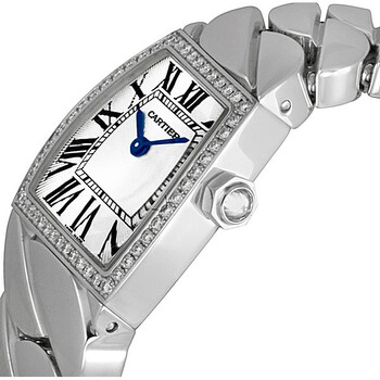18kt white gold case with a 18kt white gold bracelet. Fixed 18kt white gold set with diamonds. Silver guilloche dial with sword-shaped blue hands and Roman numeral hour markers. Minute markers on inner ring. Battery operated Swiss quartz movement. Scratch resistant sapphire crystal. 18kt white gold octagonal set with a single diamond. Solid case back. Case dimensions: 22 mm. Unique case shape. Deployment clasp. Water resistant at 30 meters / 100 feet. Functions: hours, minutes. Cartier La Dona Diamond 18kt White Gold Ladies Watch WE60039G.