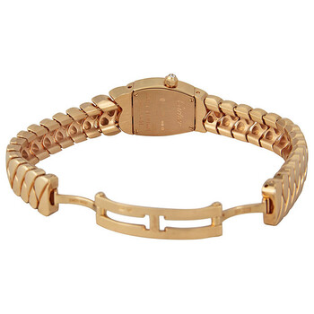 18kt rose gold case with an 18kt rose gold bracelet. Fixed 18kt rose gold bezel set with 41 diamonds (0.31 carats). Silvered guilloche sunray dial with blue hands and Roman numeral hour markers. Minute markers around the inner ring. Quartz movement. Scratch resistant sapphire crystal. Trapezoidal crown set with a single diamond. Solid case back. Case diameter: 18 mm. Unique case shape. Deployment clasp. Water resistant at 30 meters (100 feet). Cartier La Dona Mini 18k Rose Gold Diamond Watch WE60086I.