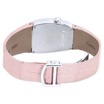 18kt white gold case with a pink (alligator) leather strap. 18kt white gold bezel set with diamonds. Silver dial with blue steel hands and Roman numeral hour markers. Minute markers around an inner ring. Dial Type: Analog. Cartier calibre 690 quartz movement. Scratch resistant sapphire crystal. Solid case back. Case dimensions: 29 mm x 27 mm. Unique case shape. Hidden fold over clasp. Water resistant at 30 meters / 100 feet. Functions: hour, minute. Luxury watch style. Watch label: Swiss Made. Cartier La Dona Silver Dial Ladies Watch WE600151.
