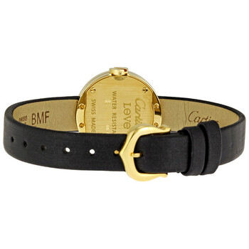 18kt yellow gold case with a black satin strap. Fixed 18kt yellow gold bezel set with 18 diamonds. Silver dial with blued-steel hands and black Roman numeral hour markers. Dial Type: Analog. Quartz movement. Scratch resistant sapphire crystal. Solid engrave case back with the word 'love' engraved. Case diameter: 24 mm. Case thickness: 6 mm. 18kt yellow gold ardillon clasp. Water resistant at 30 meters / 100 feet. Functions: hour, minute. Luxury Dress watch style. Watch label: Swiss Made. Cartier Love 18kt Yellow Gold Diamond Case Satin Strap Ladies Watch WE800931.