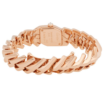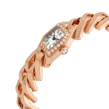 Rose gold-tone 18kt rose gold case and bracelet. Fixed rose gold-tone bezel with diamond set 18kt rose gold. Silver-tone dial with blued-steel sword-shaped hands and Roman numeral hour markers. Dial Type: Analog. Quartz movement. Scratch resistant sapphire crystal. Pull / push crown. Solid case back. Unique case shape, case size: 16 x 17 mm, case thickness: 6.8 mm. Fold over clasp with a safety release. Water resistant at 30 meters / 100 feet. Functions: hour, minute. Additional Info: set with 25 brilliant-cut diamonds totaling 0.61 carat. Maillon De Cartier Series. Dress watch style. Watch label: Swiss Made. Cartier Maillon de Cartier Quartz Diamond Silver Dial Ladies Watch WJBJ0002.