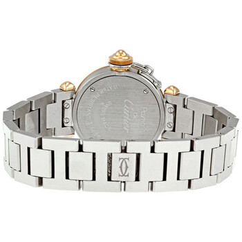 Stainless steel case with a stainless steel bracelet. Fixed 18kt rose gold bezel set with diamonds. Silver sunray dial with blue steel hands and index hour markers. Arabic numerals mark the 3, 6, 9, and 12 o'clock positions. Minute markers around the outer rim. Quartz movement. Scratch resistant sapphire crystal. Case diameter: 27 mm. Hidden folding clasp. Water resistant at 30 meters/ 100 feet. Functions: hours, minutes. Cartier Miss Pasha Silver Dial Diamond Bezel Ladies Watch WJ124021.