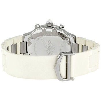 Stainless steel case with a white rubber bracelet with steel center links. Fixed stainless steel bezel engraved with Roman numeral hour markers. White dial with double CC Cartier motif, luminous hands and index hour markers. Minute markers around the outer rim. Luminescent hands and markers. Date display at the 4 o'clock position. Chronograph - three sub-dials displaying: 60 seconds, 30 minutes and 1/10th of a second. Swiss quartz movement movement. Scratch resistant sapphire crystal. Fluted stainless steel crown set with rubber cabonon. Screw down stainless steel case back. Case diameter: 38 mm. Case thickness: 10 mm. Stainless steel deployment clasp. Water resistant at 100 meters / 330 feet. Functions: hours, minutes, seconds, calendar, chronograph. Cartier Must 21 Chronoscaph Unisex Watch W10184U2.
