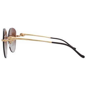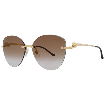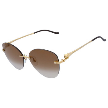 Cartier Sunglasses. Series Panthere De Cartier. Series number: CT0269S. Color code: 002. Shape: Butterfly. Lens Width: 60 mm. Lens Bridge: 15 mm. Arm Length: 140 mm. 100% UV protection. Non-Polarized. Frame Material: Metal. Frame Color: Gold. Lenses Type: Brown Multilayer. Rim Style: Rimless. UPC/EAN code: 843023152413. Cartier Panthere De Cartier Brown Multilayer Butterfly Ladies Sunglasses CT0269S 002 60.