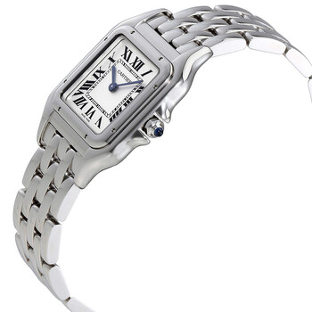 Stainless steel case with a stainless steel bracelet. Fixed stainless steel bezel. Silver dial with blued-steel sword-shaped hands and black Roman numeral hour markers. Minute markers around an inner ring. Dial Type: Analog. Quartz movement. Scratch resistant sapphire crystal. Pull / push crown. Solid case back. Square case shape. Case dimensions: 27 mm x 37 mm. Case thickness: 6 mm. Fold over clasp with a push button release. Water resistant at 30 meters / 100 feet. Functions: hour, minute. Panthere De Cartier Series. Dress watch style. Watch label: Swiss Made. Cartier Panthere de Cartier Silver Dial Ladies Watch WSPN0007.