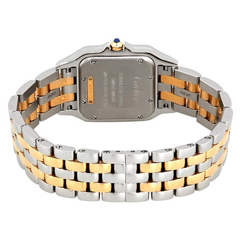 Stainless steel case with a stainless steel bracelet with 18kt yellow gold links. Fixed stainless steel and 18kt yellow gold bezel. Silver dial with blue hands and Roman numeral hour markers. Minute markers around an inner ring. Dial Type: Analog. Quartz movement. Scratch resistant sapphire crystal. Pull / push crown. Solid case back. Square case shape. Case dimensions: 29 mm x 37 mm. Case thickness: 6 mm. Hidden fold over clasp. Water resistant at 30 meters / 100 feet. Functions: hour, minute. Luxury watch style. Watch label: Swiss Made. Cartier Panthere Silver Dial Ladies Watch W2PN0007.