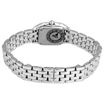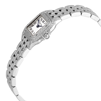 18kt white gold case and bracelet. Fixed bezel with diamond set. White dial with blue hands and Roman numeral hour markers. Quartz movement. Scratch resistant sapphire crystal. Screw down crown. Solid case back. Rectangle case shape, case size: 25 mm x 21 mm, case thickness: 6 mm. Deployment clasp. Water resistant at 30 meters / 100 feet. Functions: hour, minute. Panthère Series. Dress watch style. Watch label: Swiss Made. Cartier Panthère Mini Model Quartz Diamond White Dial Ladies Watch WJPN0019.