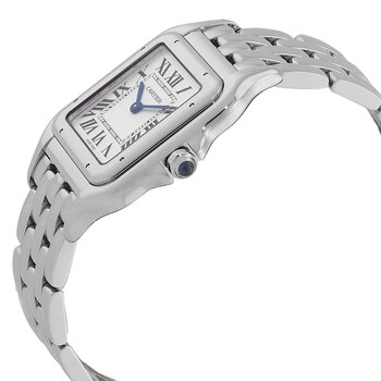 Silver-tone stainless steel case and bracelet. Fixed silver-tone stainless steel bezel. Silver dial with blued-steel sword-shaped hands and Roman numeral hour markers. Minute scale around the inner rim. Dial Type: Analog. Quartz movement. Scratch resistant sapphire crystal. Cabochon crown. Square case shape, case size: 31 mm. Fold over clasp with a safety release. Water resistant at 30 meters / 100 feet. Functions: hour, minute. Panthère De Cartier Series. Luxury watch style. Watch label: Swiss Made. Cartier Panthère De Cartier Quartz Silver Dial Ladies Watch WSPN0011.