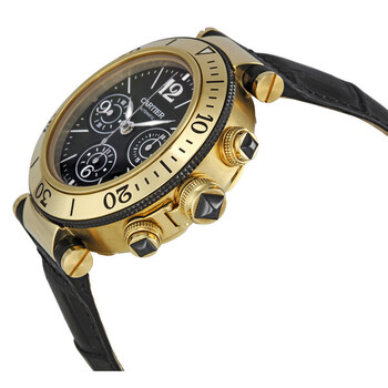 18k yellow gold case with a black leather bracelet. Uni-directional rotating bezel. Black dial with silver-tone hands and index hour markers. Minute markers around the outer rim. Date display appears between the 4 and 5 o'clock position. Three sub-dials displaying: 12 hours, 60 minutes and 30 seconds. Automatic movement. Scratch resistant sapphire crystal. Case diameter: 42.5 mm. Case thickness: 14.65 mm. Deployant buckle clasp. Water resistant at 100 meters/ 330 feet. Functions: hours, minutes, seconds, calendar, chronograph. Cartier Pasha Yellow Gold Black Dial Chronograph Men's Watch W3030017.