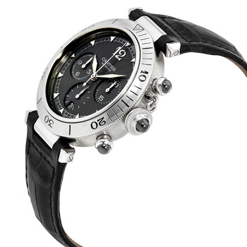 Stainless steel case with a black alligator leather strap. Uni-directional rotating platinum bezel. Gray dial with silver-tone hands and index hour markers. An Arabic numeral appears at the 12 o'clock position. Minute markers around the outer rim. Dial Type: Analog. Date display at the 6 o'clock position. Chronograph - three sub-dials displaying: 60 second, 30 minute and 12 hour. Automatic movement. Scratch resistant sapphire crystal. Transparent case back. Case size: 38 mm. Case thickness: 11 mm. Round case shape. Fold over clasp. Water resistant at 30 meters / 100 feet. Luxury watch style. Watch label: Swiss Made. Cartier Pasha Automatic Chronograph Gray Dial Ladies Watch W3107355.