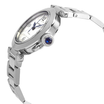 Silver-tone stainless steel case and bracelet. Fixed silver-tone stainless steel bezel. Silver dial with blue hands and index hour markers. Arabic numerals appear at the 3, 6, 9 and 12 o'clock positions. Minute markers around an inner ring. Dial Type: Analog. Luminescent markers. Cartier Calibre 1847 MC Automatic movement, containing 23 Jewels, bitting at 28800 vph, and has a power reserve of approximately 42 hours. Scratch resistant sapphire crystal. Screw down crown. Transparent case back. Round case shape, case size: 35 mm, case thickness: 9.37 mm. Deployment clasp. Water resistant at 100 meters / 330 feet. Functions: hour, minute, second. Pasha Series. Luxury watch style. Watch label: Swiss Made. Cartier Pasha Automatic Silver Dial Ladies Watch WSPA0013.