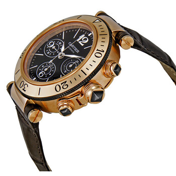 18kt rose gold case with a brown leather strap. Uni-directional rotating coin edge 18kt rose gold bezel with a count-up elapsed time top ring. Black dial with silver-tone hands and index hour markers. Arabic numerals at the the 3, 6, 9 and 12 o'clock positions. minute markers around the outer rim. Dial Type: Analog. Luminescent hands. Date display between 4 and 5 o'clock position. Chronograph - three sub-dials displaying: 60 second, 30 minute and 12 hour. Cartier Calibre 8100 MC Automatic movement, containing 41 Jewels, bitting at 28800 vph, and has a power reserve of approximately 48 hours. Scratch resistant sapphire crystal. Round case shape, case size: 42 mm. Deployment clasp. Water resistant at 100 meters / 330 feet. Functions: chronograph, date, hour, minute, second. Pasha De Cartier Series. Sport watch style. Watch label: Swiss made. Cartier Pasha Black Dial 18kt Rose Gold Chronograph Men's Watch W3030018.