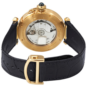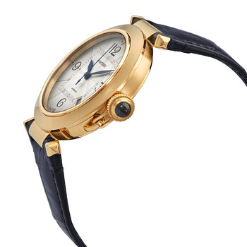 18kt yellow gold case with a blue (alligator/crocodile) leather strap. Fixed 18kt yellow gold bezel. Silver dial with blue hands and index hour markers. Arabic numerals appear at the 3, 6, 9 and 12 o'clock positions. Minute markers around an inner ring. Dial Type: Analog. Date display between the 4 and 5 o'clock positions. Cartier calibre 1847 MC automatic movement, containing 23 Jewels, bitting at 28800 vph, and has a power reserve of approximately 42 hours. Scratch resistant sapphire crystal. Pull / push crown. Transparent case back. Round case shape. Case size: 41 mm. Case thickness: 9.55 mm. Deployant clasp. Water resistant at 100 meters / 330 feet. Functions: date, hour, minute, second. Pasha De Cartier Series. Luxury watch style. Watch label: Swiss Made. Cartier Pasha De Cartier Automatic Silver Dial Men's Watch WGPA0007.