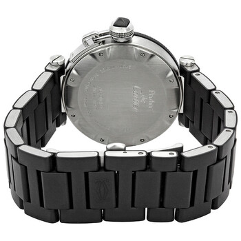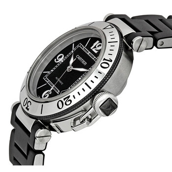 Stainless steel case with a black rubber covered stainless steel strap. Unidirectional rotating stainless steel bezel. Black dial with diamond-shaped hands and radial stick hour markers. Arabic numerals at the the 3, 6, 9 and 12 o'clock positions. Minute markers around an inner ring. Dial Type: Analog. Date displays between the 4 and 5 o'clocks. Cartier Calibre 049 automatic movement with about 42 hours of power reserve. Scratch resistant sapphire crystal. Screw down crown set with black ceramic cabochon. Solid case back. Case size: 40.5 mm. Case thickness: 13.0 mm. Round case shape. Deployment clasp. Water resistant at 100 meters / 330 feet. Functions: hour, minute, seconds hand, date. Luxury watch style. Watch label: Swiss Made. Item Variations: W31077U2, Cartier-W31077U2. Cartier Pasha Seatimer Steel Rubber Men's Watch W31077U2.