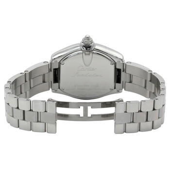 Stainless steel case with a stainless steel bracelet. Fixed stainless steel bezel. Pink dial with luminous hands and black Roman numeral hour markers hour markers. Minute markers around an inner ring. Date display at the 3 o'clock position. Quartz movement. Scratch resistant sapphire crystal. Screw down crown. Solid case back. Case dimensions: 36 mm x 30 mm. Case thickness: 9.0 mm. Hidden deployment clasp. Water resistant at 100 meters / 330 feet. Functions: hours, minutes, date. Additional Info: includes burgundy fabric interchangeable strap. Cartier Roadster Pink Ladies Watch W62017V3.
