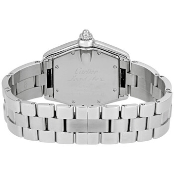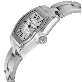 Stainless steel case with a stainless steel bracelet. Fixed stainless steel bezel. Silver dial with luminous hands and black Roman numeral hour markers. Minute markers around an inner ring. Dial Type: Analog. Luminescent hands. Date display at 3 oclock with a magnifying window. Self-winding automatic movement. Scratch resistant sapphire crystal. Screw down crown. Screw in solid case back with Cartier Roadster engraving and serial number. Case diameter: 39 mm. Case thickness: 10 mm. Tonneau case shape. Hidden deployment clasp. Water resistant at 100 meters / 330 feet. Functions: hour, minute, second, date. Additional Info: includes interchangeable cloth strap. Luxury watch style. Watch label: Swiss Made. Cartier Roadster Steel Automatic Men's Watch W62025V3.