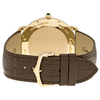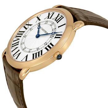 18kt rose gold case with a brown alligator leather strap. Fixed 18kt rose gold bezel. Silvered flinque dial with blued-steel apple-shaped hands and black Roman numeral hour markers. 24 hour markings. minute markers around an inner ring. Dial Type: Analog. Cartier Calibre 430 MC hand wind movement with a 40-hour power reserve. Scratch resistant sapphire crystal. Circular-grained set with a cabochon sapphire crown. Solid case back. Round case shape, case size: 42 mm, case thickness: 7.19 mm. Tang clasp. Water resistant at 30 meters / 100 feet. Functions: hour, minute. Luxury watch style. Watch label: Swiss Made. Cartier Ronde Louis Cartier Silvered Flinque Dial Men's Watch W6801004.