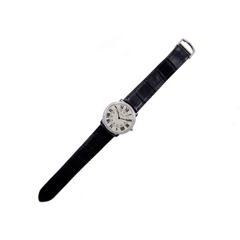 18 kt white gold case with a black alligator leather strap. Fixed 18 kt white gold diamond set bezel. Silver dial with blued-steel apple-shaped hands and black Roman numeral hour markers. Minute markers around an inner ring with 24 hour scale. Dial Type: Analog. Cartier Calibre 430 MC hand wind movement with a 40-hour power reserve. Scratch resistant sapphire crystal. Diamond set crown. Solid case back. Round case shape, case size: 36 mm, case thickness: 6.51 mm. Deployment with push button release clasp. Water resistant at 30 meters / 100 feet. Functions: GMT, second time zone, hour, minute. Luxury watch style. Watch label: Swiss Made. Cartier Ronde Louis Large Model Diamond Bezel Silver Dial 18 kt White Gold Ladies Watch WR000551.