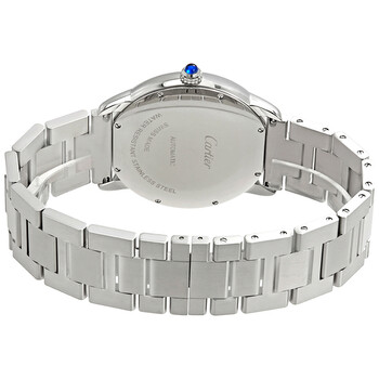 Stainless steel case with a stainless steel bracelet. Fixed stainless steel bezel. Blue dial with silver-tone hands and Roman numeral hour markers. 24 hour markers. Minute markers around an inner ring. Dial Type: Analog. Date display at the 3 o'clock position. Automatic movement. Scratch resistant sapphire crystal. Pull / push crown set with a blue spinel cabochon. Solid case back. Round case shape. Case size: 42 mm. Case thickness: 8.36 mm. Hiden fold over clasp. Water resistant at 30 meters / 100 feet. Functions: date, hour, minute, second. Dress watch style. Watch label: Swiss Made. Cartier Ronde Solo Automatic Blue Dial Men's Watch WSRN0023.