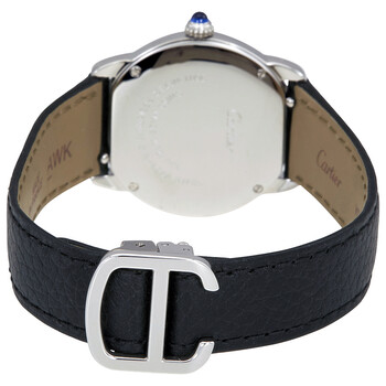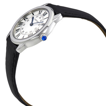Stainless steel case with a black (grained calfskin) leather strap. Fixed stainless steel bezel. Silvered light opaline dial with blued-steel sword-shaped hands and black Roman numeral hour markers. 24 hour markers. Minute markers around an inner ring. Dial Type: Analog. Quartz movement. Scratch resistant sapphire crystal. Pull / push crown. Solid case back. Round case shape. Case size: 29 mm. Case thickness: 6.35 mm. Fold over clasp. Water resistant at 30 meters / 100 feet. Functions: hour, minute, second. Dress watch style. Watch label: Swiss Made. Cartier Ronde Solo Silvered Light Opaline Dial Ladies Watch WSRN0019.