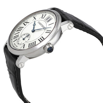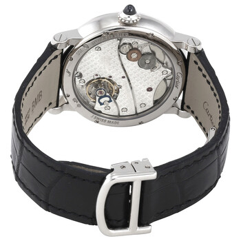 18kt white gold case with a black leather strap. Fixed bezel. Silver guilloche dial with blue steel hands and Roman numeral hour markers. Minute markers around the outer rim. Date display appears at the 12 o'clock position. Small seconds sub-dials. Manual winding movement. Scratch resistant sapphire crystal. Case diameter: 35 mm. 18kt gold deployment clasp. Water resistant at 30 meters/ 100 feet. Functions: hours, minutes, seconds, calendar. Cartier Rotonde 18kt White Gold Case Unisex Watch W1552851.