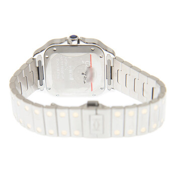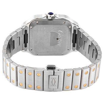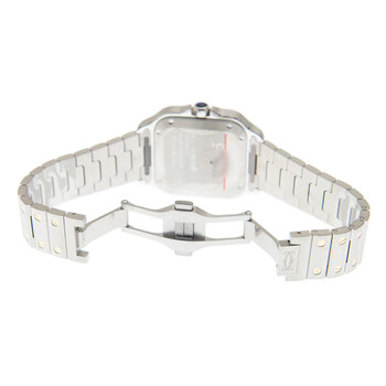 Stainless steel case with a stainless steel with 18kt yellow gold screws bracelet. Fixed 18kt yellow gold bezel. Silver dial with blued-steel sword-shaped hands and Roman numeral hour markers. Minute markers around an inner ring. Dial Type: Analog. Cartier Calibre 1847 MC Automatic movement, containing 23 Jewels, bitting at 28800 vph, and has a power reserve of approximately 42 hours. Scratch resistant sapphire crystal. Cabochon crown. Solid case back. Square case shape, case size: 35.1 mm, case thickness: 8.83 mm. Deployment with push button release clasp. Water resistant at 100 meters / 330 feet. Functions: hour, minute, second. Santos Series. Luxury watch style. Watch label: Swiss Made. Cartier Santos Automatic Silver Dial Watch W2SA0016.