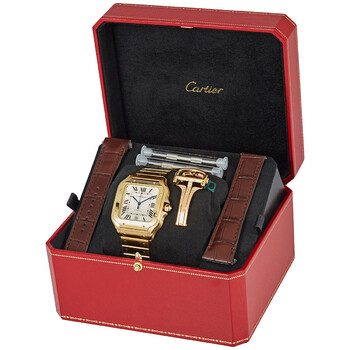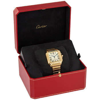 18kt yellow gold case and bracelet. Fixed 18kt yellow gold bezel. White dial with blue hands and Roman numeral hour markers. Minute markers around an inner ring. Date display at the 6 o'clock position. Cartier calibre 1847 automatic movement. Scratch resistant sapphire crystal. Screw down crown. Solid case back. Square case shape. Case size: 39.8 mm. Case thickness: 9.08 mm. Tang clasp. Water resistant at 100 meters / 330 feet. Functions: date, hour, minute, second. Santos Series. Sport watch style. Watch label: Swiss Made. Cartier Santos Automatic White Dial 18kt Yellow Gold Men's Watch WGSA0029.