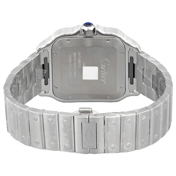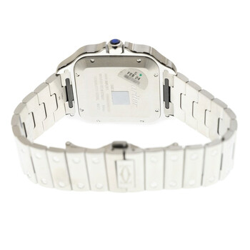 Silver-tone stainless steel case and bracelet. Fixed blue stainless steel bezel. Silver-tone dial with blued-steel sword-shaped hands and Roman numeral hour markers. Minute scale around the inner rim. Dial Type: Analog. Luminescent hands. Date display at the 6 o'clock position. Cartier Calibre 1847 MC Automatic movement, containing 23 Jewels, bitting at 28800 vph, and has a power reserve of approximately 42 hours. Scratch resistant sapphire crystal. Cabochon crown. Solid case back. Square case shape, case size: 39 mm. Fold over clasp with a safety release. Water resistant at 100 meters / 330 feet. Functions: date, hour, minute, second. Additional Info: original box, international warranty card, manual (complete accessories). Santos De Cartier Series. Luxury watch style. Watch label: Swiss Made. Cartier Santos De Cartier Automatic Silver Dial Men's Watch WSSA0047.