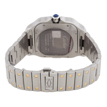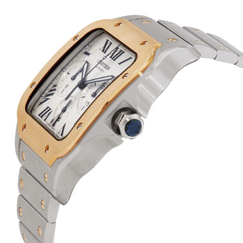 Stainless steel & 18k yellow gold case with a brushed & polished stainless steel & 18k yellow gold bracelet. Fixed 18k yellow gold bezel. Silver dial with black hands and Roman numeral hour markers. Dial Type: Analog. Luminescent hands. Date display at the 6 o'clock position. Chronograph - three sub-dials displaying: 12 hours, 30 minutes, 60 seconds. Cartier Calibre 1904-CH MC Automatic movement, based upon Cartier 1904-PS MC, containing 35 Jewels, bitting at 28800 vph, and has a power reserve of approximately 48 hours. Scratch resistant sapphire crystal. Pull / push crown. Solid case back. Square case shape, case size: 43.3 mm x 51.3 mm, case thickness: 12.5 mm. Push button deployant buckle clasp. Water resistant at 100 meters / 330 feet. Functions: chronograph, date, hour, minute, second. Santos De Cartier Series. Luxury watch style. Watch label: Swiss Made. Cartier Santos De Cartier Chronograph Automatic Silver Dial Men's Watch w2sa0008.