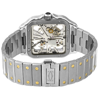 Stainless steel case with a stainless steel bracelet. Fixed 18kt yellow gold bezel. Transparent dial with blue hands and index hour markers. Roman numerals appeat at the 3, 6, 9 and 12 o'clock positions. Dial Type: Analog. Cartier calibre 9611 MC hand wind movement, containing 20 Jewels, composed of 138 parts, bitting at 28800 vph, and has a power reserve of approximately 72 hours. Scratch resistant sapphire crystal. Screw down crown set with a faceted sapphire. Transparent case back. Square case shape. Case dimensions: 39.8 mm x 39.8 mm. Case thickness: 9 mm. Deployment clasp. Water resistant at 100 meters / 330 feet. Functions: hour, minute. Santos De Cartier Series. Sport watch style. Watch label: Swiss Made. Cartier Santos De Cartier Hand Wind Skeleton Men's Watch WHSA0012.
